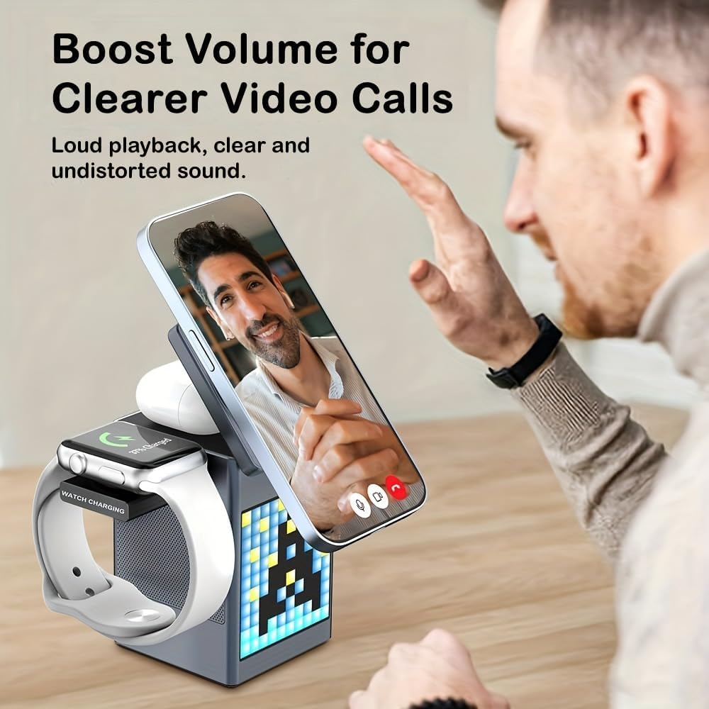 Simplify your desktop setup with this 3-in-1 Bluetooth Speaker Wireless Charger — a sleek all-in-one device that combines fast wireless charging, Bluetooth music playback, and hands-free calling.